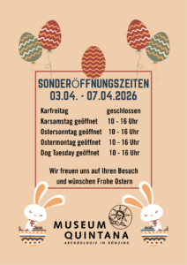 Welche Kleidung haben die Römer getragen? Gab es damals schon T-Shirts und Reißverschlüsse? Im Ferienprogramm „Römische Fibel“ dreht sich alles um die römische Mode. Nach einer kindgerechten Führung durch das Museum Quintana, bei der römische Kleidung und ihre Bedeutung im Mittelpunkt stehen, wird selbst gestaltet: Die Teilnehmerinnen und Teilnehmer fertigen eigene Gewandnadeln nach archäologischen Vorbildern an.Eintritt: 8,00 € (inkl. Museumseintritt und Materialkosten)
